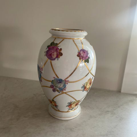 15 cm i diameter, 8,8 cm høy. Rimantisk underskål el til blomster dekorasjon o.l.