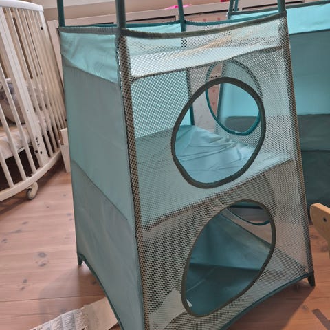 IKEA oppbevaringshylle laget av blått nettmateriale. Hylle med flere rom, designet for enkel oppbevaring og organisering. Passer for barnerom eller andre rom hvor det trengs lett tilgjengelig oppbevaring.