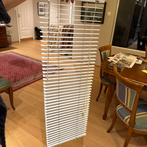 2 stk Persienne vindusgardiner i hvit farge med mål 110cm bredde og 130 cm høyde. Laget av plastmateriale. Passer til vinduer og gir mulighet for justerbar lysinnslipp. Mangler stang for blending
