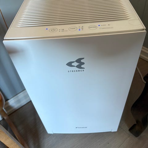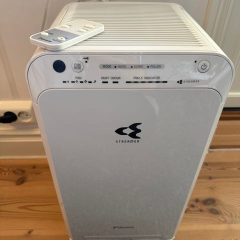 Jeg selger en helt ny Daikin MCQ30ZBFVM3 luftrenser i hvit farge. Produktet har et kompakt design med luftinntak og betjeningspanel på toppen. Leveres med bruksanvisning og ekstra filter. Egnet for bruk i hjem eller kontor for forbedring av innendørs luftkvalitet.