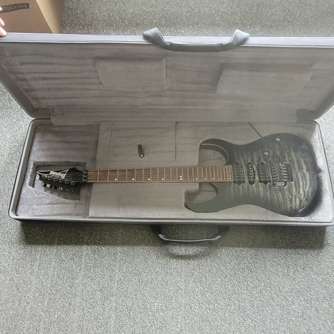 Svart-grå gradient finish. Gripebrett i rosentre, kropp i basswood med flammelønn topp, alt originalt bortsatt fra båndene som er skiftet til stainless steel som vil vare livet ut. Floyd Rose bro, split coils i neck og bro. Alt fungerer som det skal.