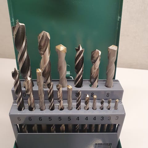 Forstnerbor sett med 5 deler. Inkluderer forskjellige størrelser for presis boring i treverk. Borene er laget av metall og oppbevares i en plastkasse for enkel organisering og transport.
