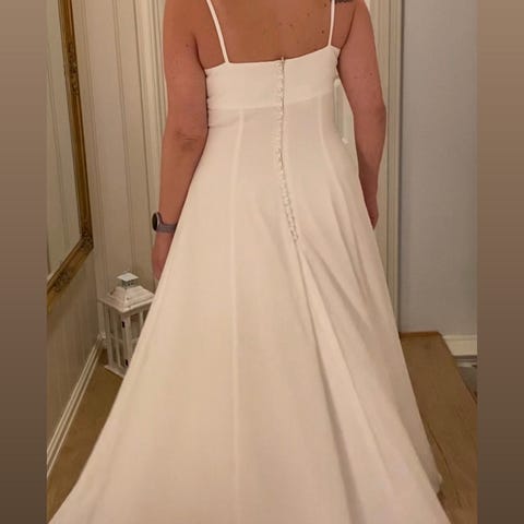 Den vil være enkel å sy inn og ut🥰 Kjolen er kun prøvd på og fremstår helt ny. Den sitter utrolig fint på, med en nydelig og unik rygg som virkelig gjør den spesiell. En drøm av en kjole!