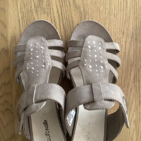 Selger et par fine sandaler med kilehæl, merket Softwalk. De er lys brune men trenger å bli pusset. Er i skinn og lite brukt