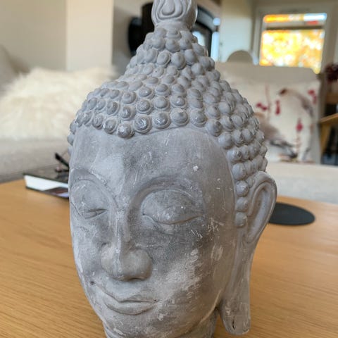 Buddha hode skulptur laget i tre. Håndlaget med detaljer som viser tradisjonell design. Skulpturen er montert på en svart metallstativ for stabilitet og visning. Passer som dekorasjon i hjem eller kontor.