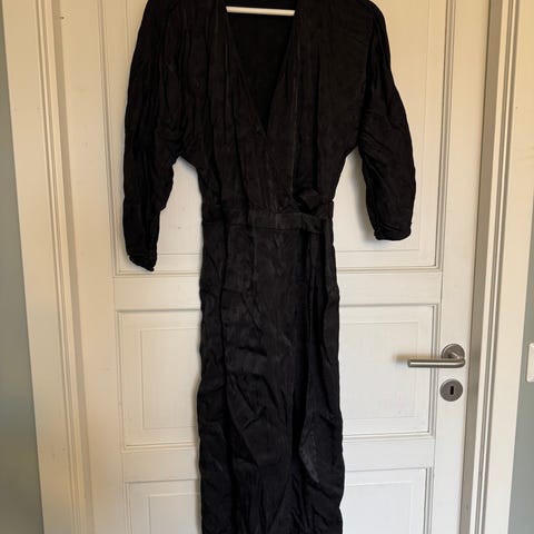 Nydelig silkekjole i en fin grålig farge, lillablågrå med fine detaljer i silkestoffet. V hals og belte i livet som kan knyttes i flere varianter, foran eller bak. Fin passform, halve ermer med svak puff look. Kjolen er nesten ikke brukt og har ligget nedpakket. Str XS./34. 100% silke.
