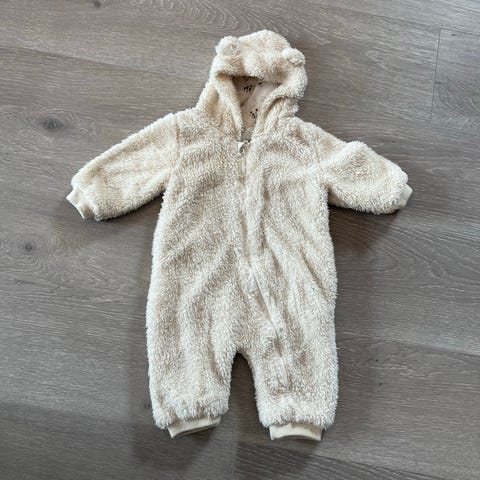 Lindex barnedress i størrelse 62, hvit farge, unisex. Laget i mykt materiale med hette og glidelås foran. Passer for små barn 2-4 mnd