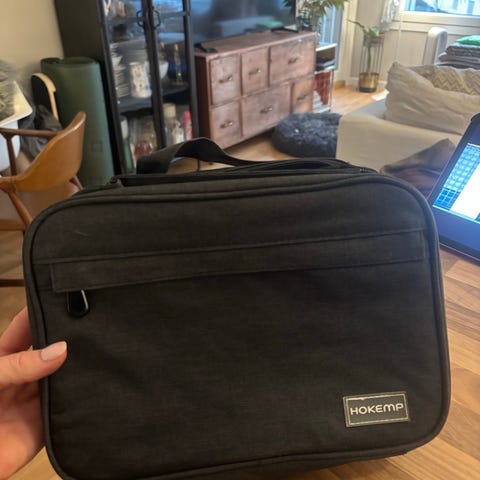 perfekt for reise eller hjemmebruk. Vesken har krok i toppen for enkel oppheng på badet.