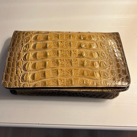 Skinnclutch, slangeskinn iflg KI. Kjenner på skinnet at det er «leddet» som på en sild. Vet ikke annen måte p forklare det på. Retro. 25 cm bredde, 13 cm høyde og 3 cm bredde i bunn. Håndsydd med skinnrem. 3 rom. Lukning ved å dytte lokket ned innenfor en skinnrem foran.