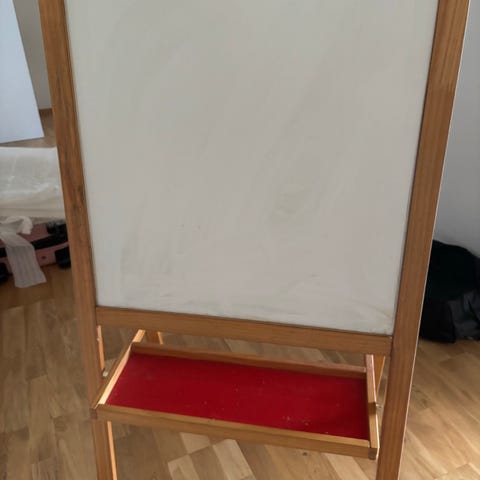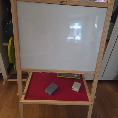 Med denne flotte tosidige tavlen kan barna både leke og lære! Tavlen er todelt på bein hvor den ene siden har kritt-tavle og den andre whiteboard. Her kan barna tegne, skrive, regne og bruke magneter til å henge ting opp. Under tavlen er det et praktisk brett hvor alt tilbehør kan oppbevares.