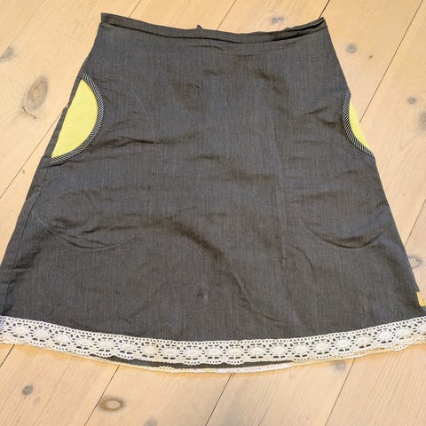 Tulip & Tatamo blyantskjørt i størrelse M. Skjørtet er mørkegrønt, har to lommer med bilmotiv og en splitt bak med gult fôr.