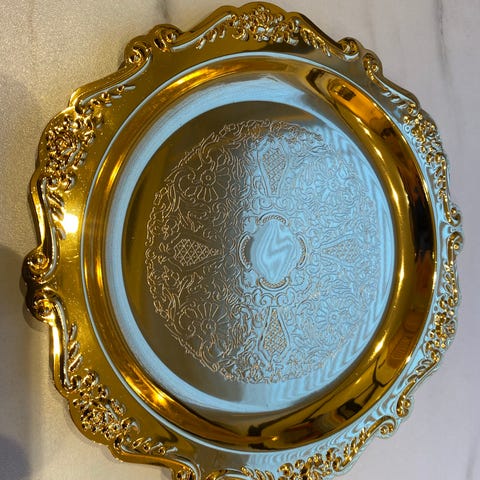 4 stilige (forskjellige) motiv i gulldekor på mørk bunn.