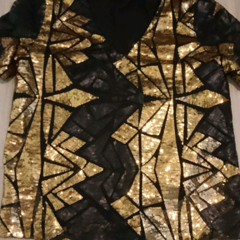 Skinnende gullpaljettdetaljer på en svart t-skjorte. ICHI-merke.