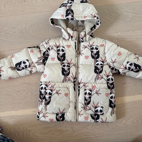 KappAhl barnejakke i størrelse 122 for jenter. Jakken er beige med et mønster av dyr og hjerter, utstyrt med hette og glidelås. Materialet er mykt og egnet for barn, designet for å gi komfort og beskyttelse mot vær. Perfekt for vinterkulda. En knapp på hette har falt av, men ikke kritisk.