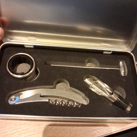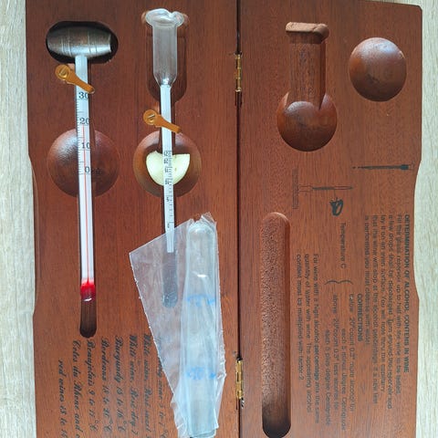 Fint etui i tre inneholdende en vin/temperaturmåler og vinopptrekker i 3 deler. Kvalitet og i god stand.