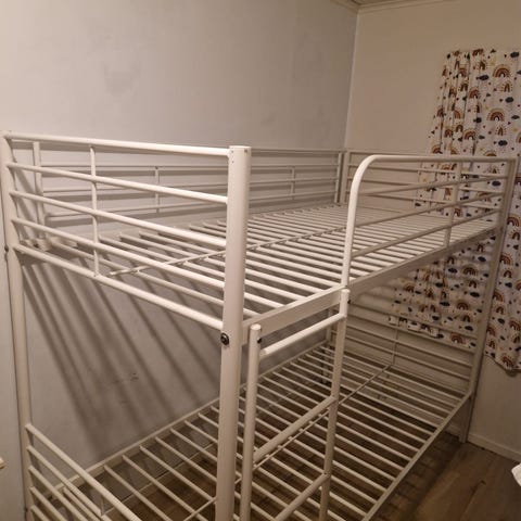 IKEA køyeseng for barn laget av metall. Sengen har to nivåer, med en stige for tilgang til øverste seng. Egnet for barnerom og gir plassbesparende soveplass for to barn.