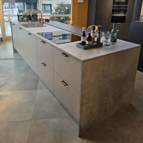eik-bordplate – 150×121 cm, 8 cm tykk – brukt som bar-/kjøkkenseksjon