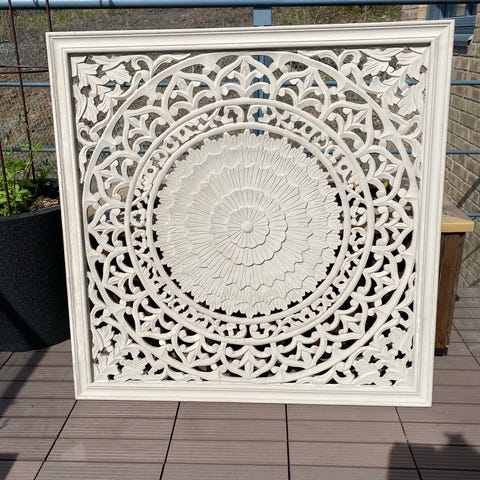 Ukjent merke dekorativ panel laget av tre med utskåret mønster i hvit farge. Panelet har et intrikat blomster- og bladmotiv og kan brukes til veggdekorasjon eller som et dekorativt element i interiør.