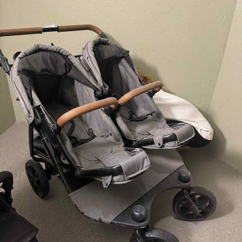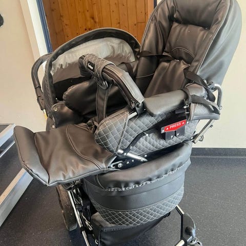 Noen som selger tandem søskenvogn, med to sittedeler enten fargen svart eller beige.