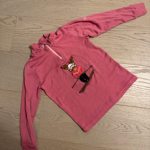 Str 122-128, men er mer en 116. Den kan vrenges og brukes med begge farger. Figurene som er på jakken er reflekser. Ingen hull eller rifter