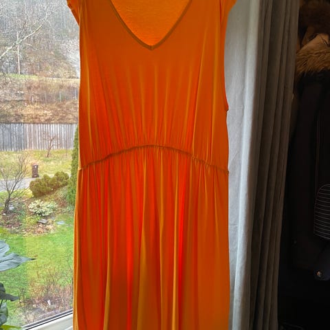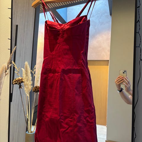 Detaljer: Tynne, doble og justerbare spaghettistropper. Lang glidelås og en liten splitt/spalte bak for god bevegelse.