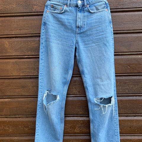 Gina Tricot Denim Jeans , størrelse XXS med midjevidde W28. Laget av denim materiale, designet for kvinner. Tre fine bukser selges helst samlet. Str 34.