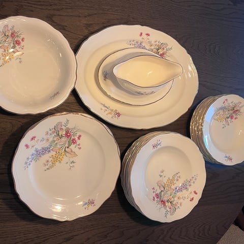 Nydelig servise med blomsterdekorasjon, inkludert tallerkener, dype tallerkener, og serveringsskål med lokk. Større serveringsfat. Materialet er porselen med håndmalt blomsterdesign i rosa, lilla og blå toner.