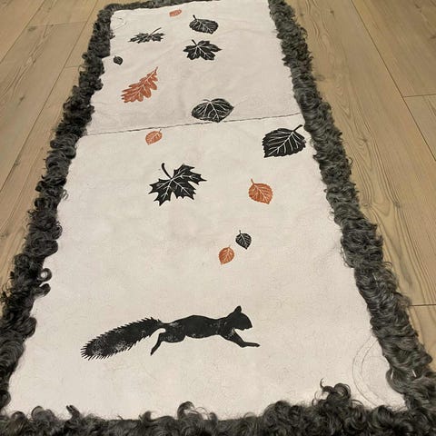 Ekstra tykk og stor skinnfell av et Gotlandsskinn. Hovedfarger grått og hvitt. Pleddet er i helull og godt og tykt. Pleddet er sydd på for hånd og med dobbel voksa lintråd. Fellen er også kantet med Skinnreimer i grå svineru.