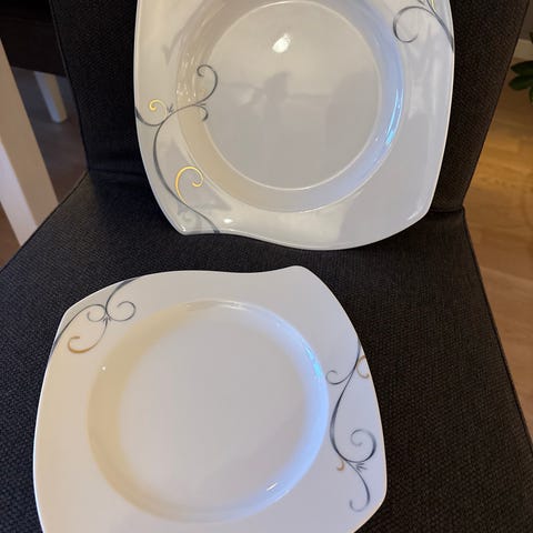 8 deler, to middagstallerkner, to frokost tallerkner, to dype tallerkner og to små skåler. Selges samlet for 800kr. Må hentes.