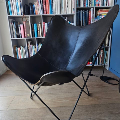 Selger vår Butterfly stol fra Cuero Design pga plassmangel. Stolen er veldig behagelig å sitte i. Det er slitt bort noe av saueskinnet der man legger armer og ben men ellers er den helt fin 😊 ta gjerne kontakt om du ønsker å se flere bilder.