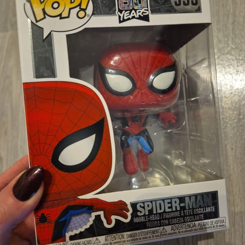 Funko Marvel 80 Years Amazing Spider-Man Pop! vinyl figur nummer 495. Limited edition samlerobjekt med detaljer inspirert av Spider-Man-karakteren. Passer for samlere og fans av Marvel-serien. Det er en liten skade på esken.