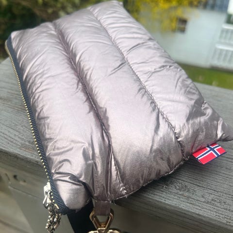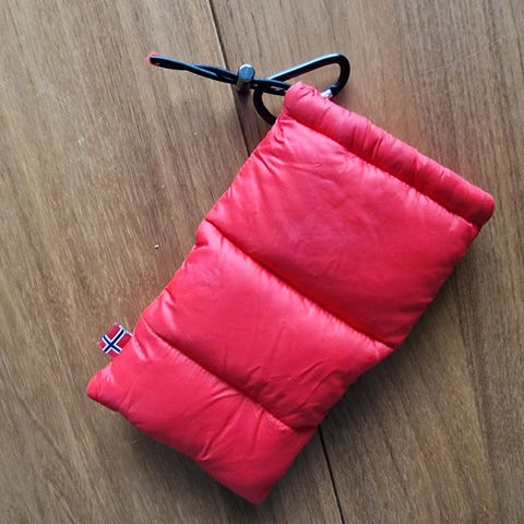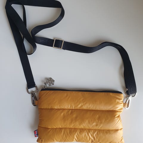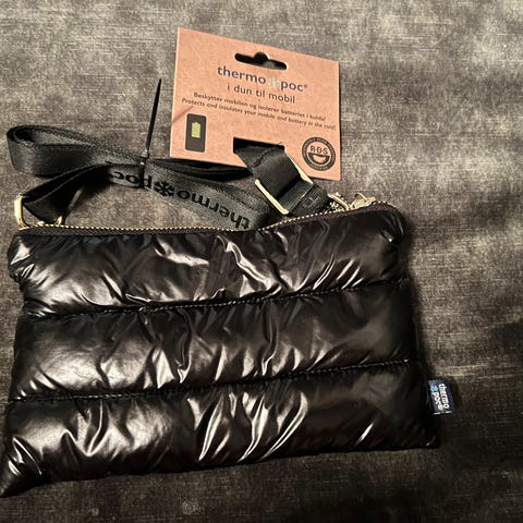 Helt ny, ubrukt dunveske fra norske ThermoPoc. Passer alle mobiler, holder den varm i kulden slik at batteriet varer lenger. Fargen er orkergul/sennep. Du kan klippse av reima, sånn at den bare blir en mobillomme/håndveske. Solbrillene er kun ment til å vise størrelsen, de følger ikke med.