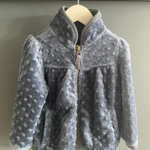 POMPdeLUX fleecejakke i lilla farge, størrelse 98 (romslig i størrelse) designet for jenter. Laget av fleece-materiale som gir varme og komfort. Jakken har glidelås foran og teksturert overflate med prikker.