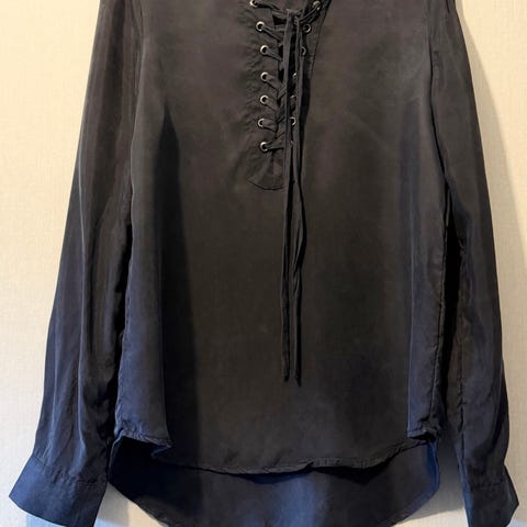 Fin sort bluse med snøring, viskose, pent bruktbet fåtall ganger. Størrelse S.
