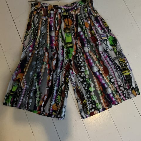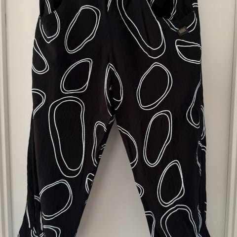 Sprek bukse, str M, selges. Den er ikke brukt da jeg har kjøpt den for liten. Strikk i livet og lommer i sidene. Benlengde 65cm, viskose og polyester. Den skal være litt kort og går inn nederst