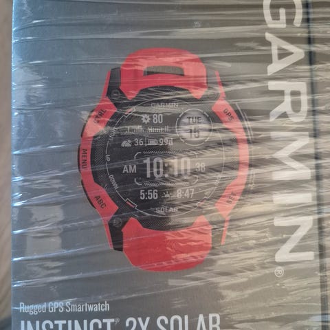 Garmin Instinct Solar smartklokke med solcellelading, svart farge, og gummirem. Klokken har digital skjerm med tid, dato og aktivitetsmåling. Leveres med ekstra remmer og lader. Passer til bruk for utendørsaktiviteter og trening.