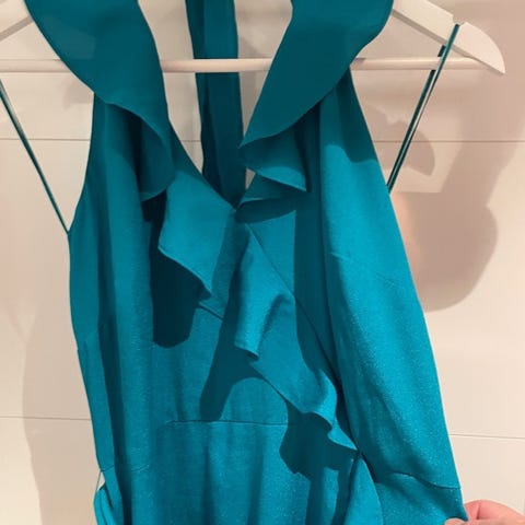 Nydelig kjole i koboltblå farge innkjøpt hos nisjebutikk i Trondheim for 15 år siden. Brukt 2 ganger. Helt feilfri. 95% polyester, 5% elastan. Str 6, made in France på merkelapp.