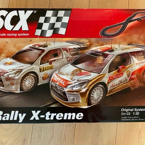 SCX Compact Racerbilbane sett med mål 65 x 155 cm. Inkluderer to fjernkontroller med ledninger, to racerbiler og flere deler til baneoppsett. Bane og tilbehør er laget for innendørs bruk og passer for barn og voksne som ønsker å sette opp og kjøre på en elektrisk racerbilbane.