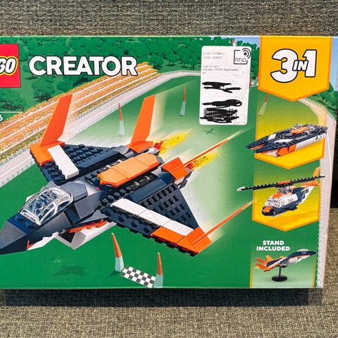 LEGO Creator 3-i-1 sett som inkluderer et fly, et helikopter og en båt.