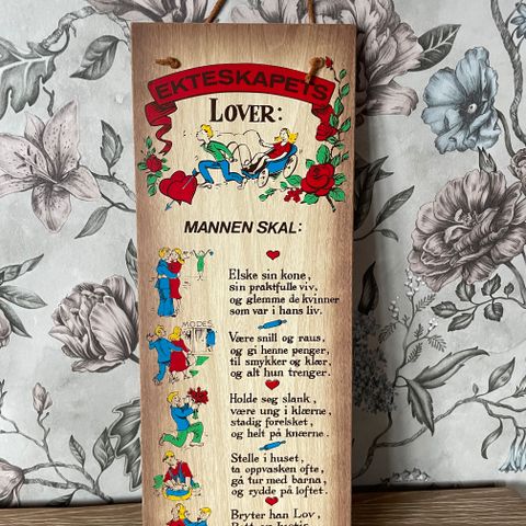 Morsomt skilt/bilde/veggpynt, teksten om ekteskapets lover - kvinnen skal er på rim. Ingen skader, hel og pen. Kan sendes for kr 70 med PostNord.