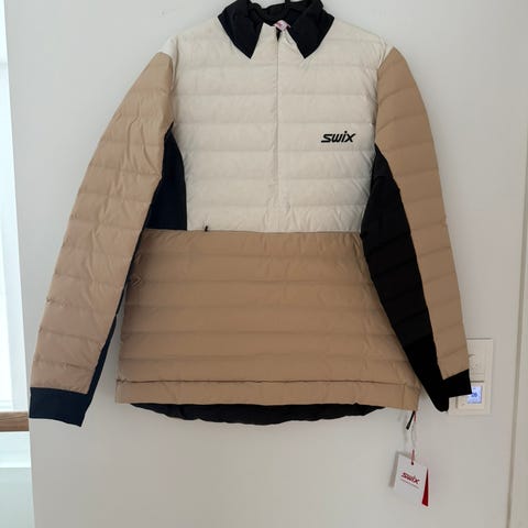 Jakken har en kombinasjon av lys og mørk rosa farge, med flere glidelåslommer foran. Den er designet for utendørsaktiviteter, med funksjonelle detaljer som hette og justerbare elementer. Materialet er tilpasset for å gi komfort og beskyttelse under aktivitet.