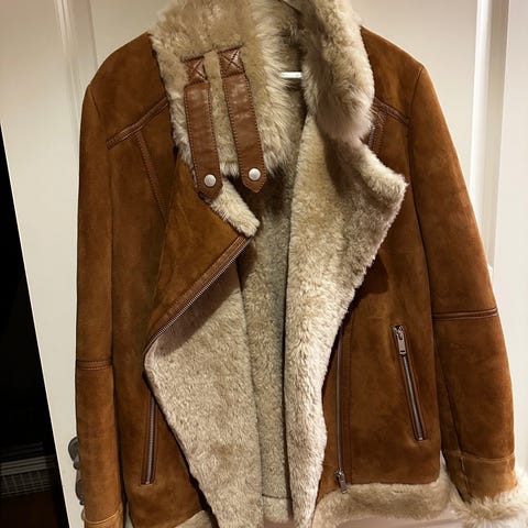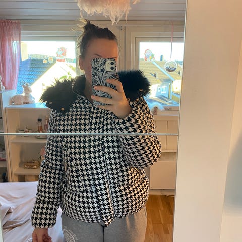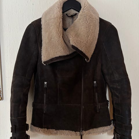 God og varm ytterjakke i fuskepels og tekstil med kule detaljer. To små lommer på fremsiden som kan lukkes. Fin både åpen og lukket.