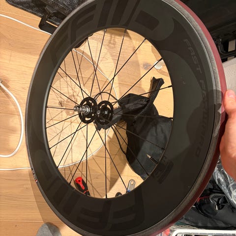 Pent brukte DT Swiss alu banehjul til salgs. Dekk og slange inkludert. Bakdekk er helt nytt. OBS: klinger ikke inkludert.