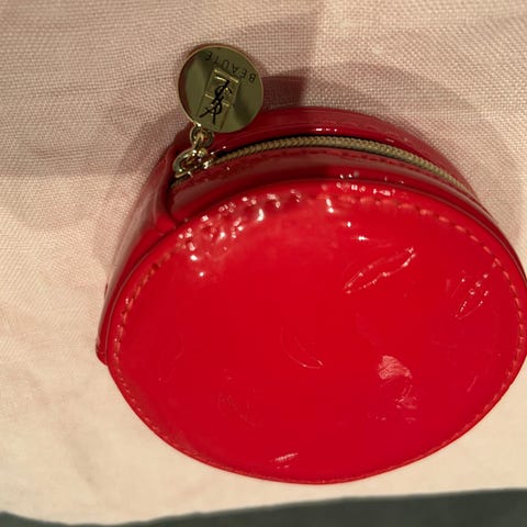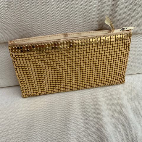Lekker sminkeveskei gullfarget stoff med stor sløyfe i front og prikkete for inni.