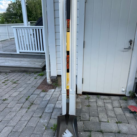 Med aluminiumsblad og lakkert treskaft med plasthåndtak. Den korte utførelsen gjør den perfekt til å måke snø, sand og lignende.