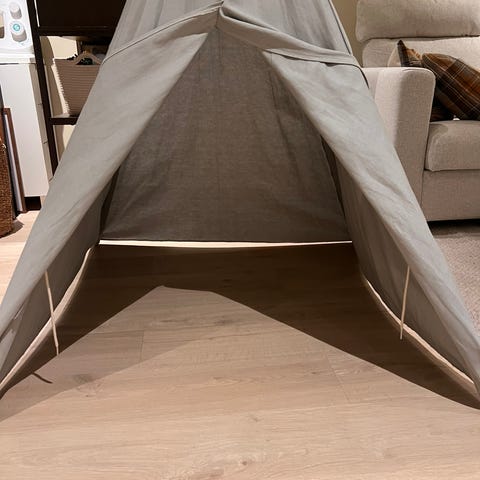 Jeg selger to tipi-telt. Det ene er blått og det andre er rosa. Begge teltene er i perfekt stand, uten flekker, rifter eller skader. Det massive treverket og stoffet som brukes er miljøvennlig og bærekraftig.