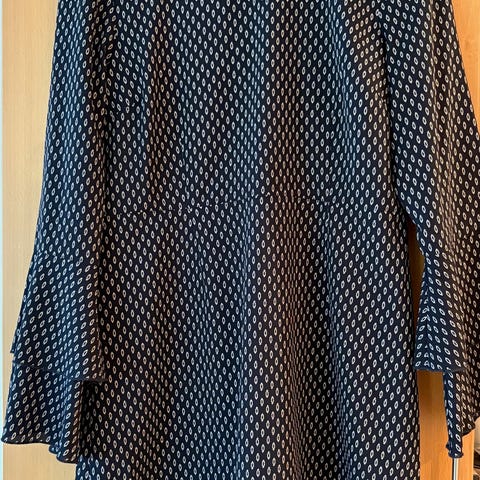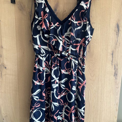 Marineblå kjole med hvite prikker. Feminint snitt.