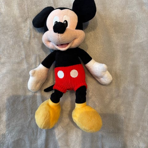 Disney Mickey Mouse kosedyr i gul stoff med svarte detaljer. Myk og egnet for barn. Produktet har en samlet lengde som passer for barnelek og kos.