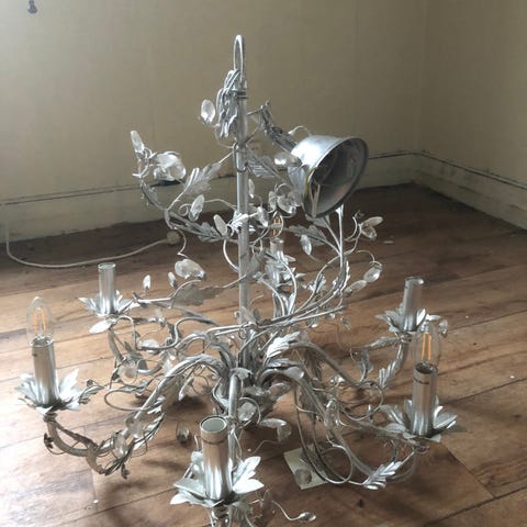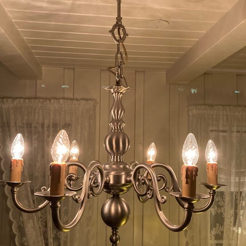 Selger en fin og klassisk lysekrone i sølvfarget metall med hengende krystalldekor. Lampen har 5 armer og bruker standard E14-pærer. Den gir et varmt og stemningsfullt lys, og passer perfekt over spisebord, i stue eller entré.