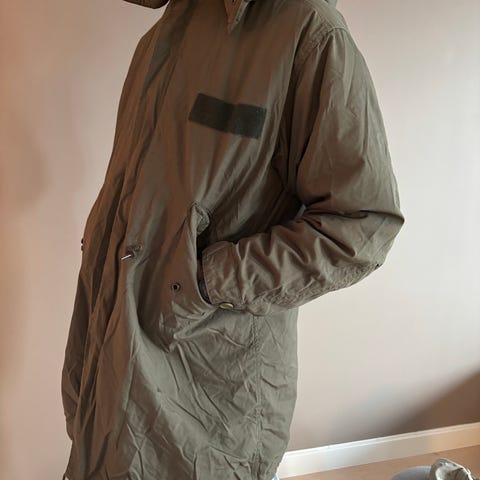Bluewear parkas til herre, størrelse M. Har noen flekker nederst, men det er nesten ikke synlig, ikke forsøkt vasket. I fin stand ellers. Avtagbar hette.